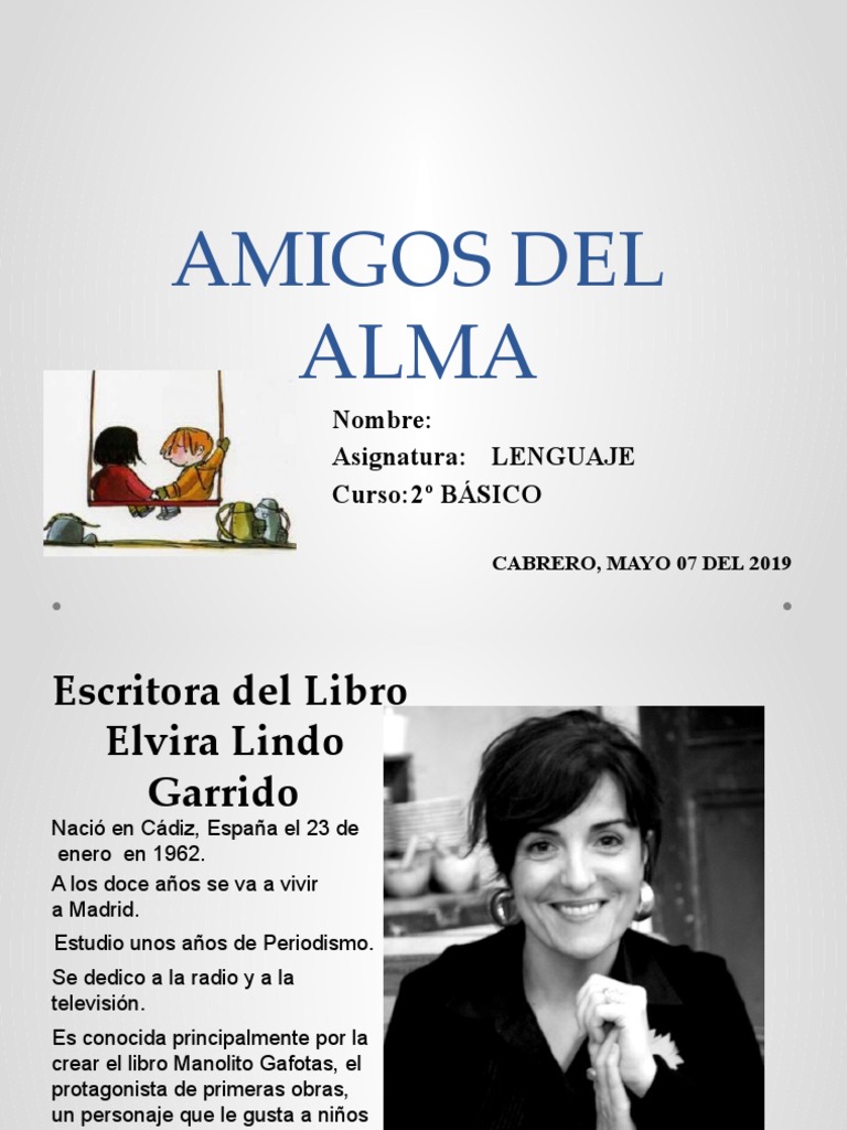 Amigos del Alma Elvira Lindo No preview available - 1999. About the author (2004). Entre sus trabajos para el cine, destacan sus colaboraciones, sobre todo como guionista pero también como actriz ocasional, con el director Miguel Albadalejo (La primera noche de nuestra vida, El cielo abierto y Manolito Gafotas). En el 2005 ganó el Premio.