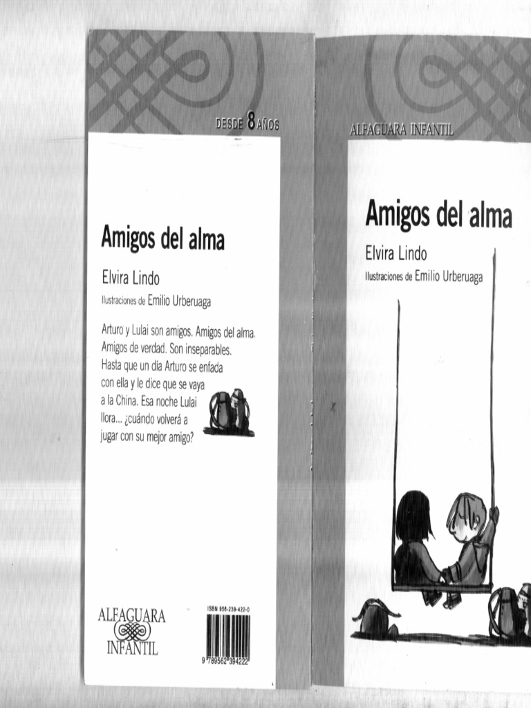 Amigos del alma. Elvira Lindo. Alfaguara, 2000 - Juvenile Fiction - 32 pages. Arturo y Lulai son amigos. Amigos del alma. Amigos de verdad. Les gustan las mismas cosas y siempre se divierten con los mismo. Son inseparables. Hasta que un dia Arturo se enfada con ella y le dice que se vaya a la China y no regrese nunca mas.