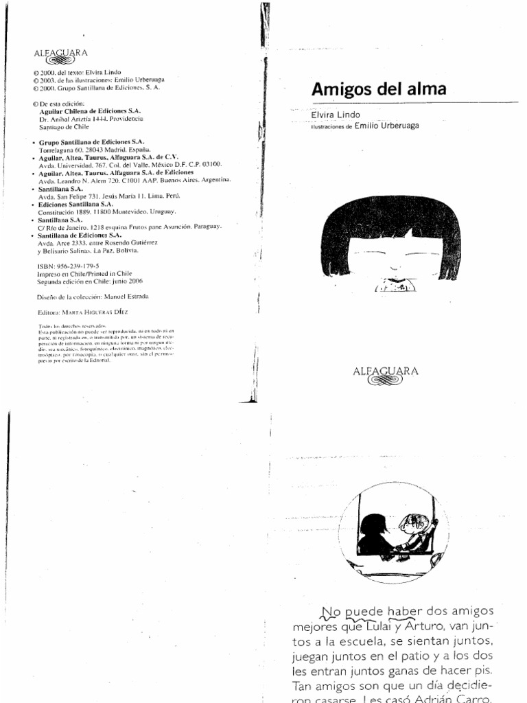 Books. Amigos Del Alma. Elvira Lindo. Ediciones Alfaguara, Jul 15, 2016 - Juvenile Fiction - 45 pages. Arturo and Lulai are best friends. They like the same things and always have fun together. They are inseparable. Until one day, Arturo gets mad at her and tells her to go to China and never come back. That night, Lulai can't stop crying.