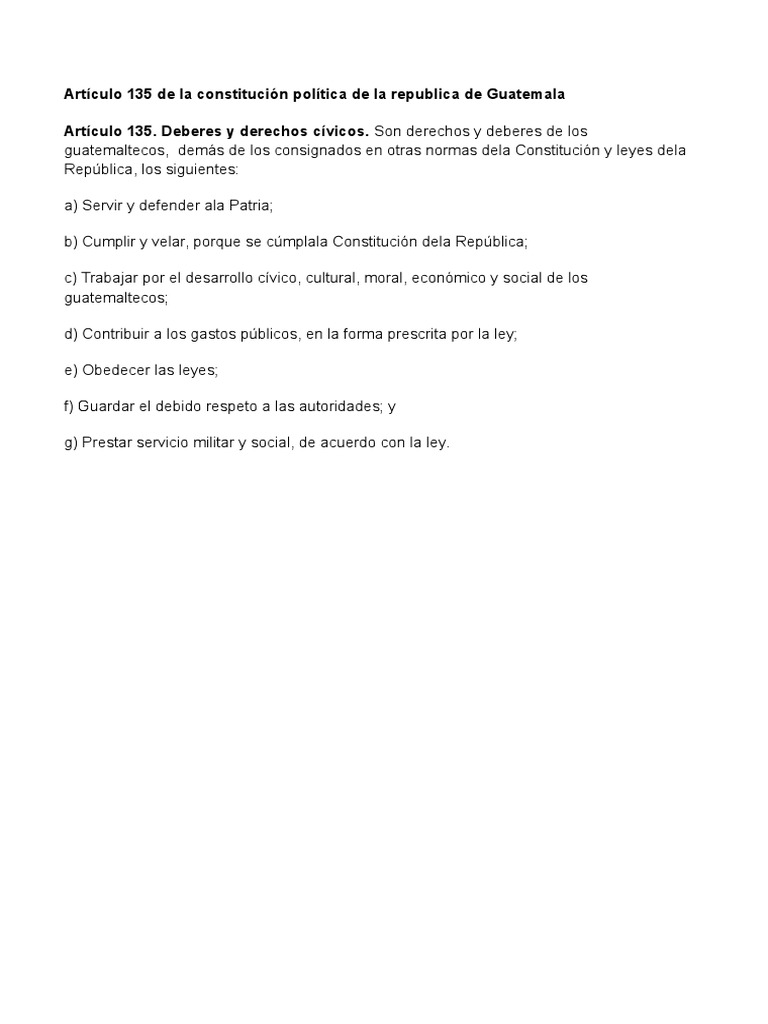 Constitución de la República de Guatemala. Artículo 135. Deberes y derechos cívicos. Son derechos y deberes de los guatemaltecos, demás de los consignados en otras normas dela Constitución y leyes dela República, los siguientes: a) Servir y defender ala Patria; b) Cumplir y velar, porque se cumplala Constitucióndela República;
