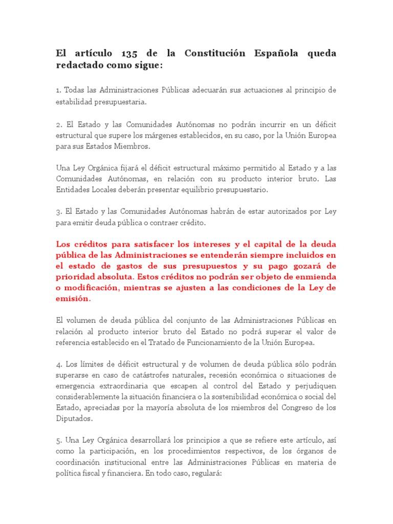 Madrid - Nov 24, 2014 - 13:37 EST. El artículo 135 de la Constitución, antes de la reforma pactada entre PSOE y PP en 2011, decía lo siguiente:.