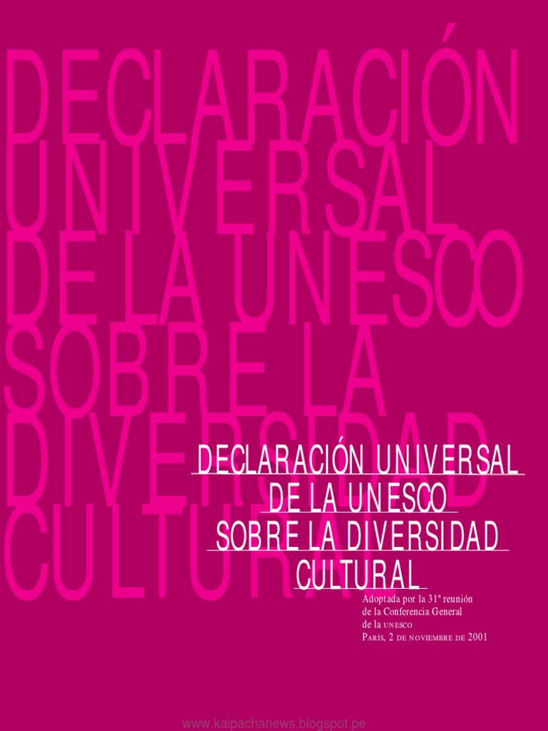 Declaración Universal de la UNESCO sobre la Diversidad Cultural. Este texto fue adoptado por la Conferencia General de la UNESCO el 2 de noviembre del año 2001, el cual plantea la diversidad cultural como una multiplicidad de formas en la que se expresan las culturas de las sociedades; cuando se manifiesta, se enriquece y se transmite el.