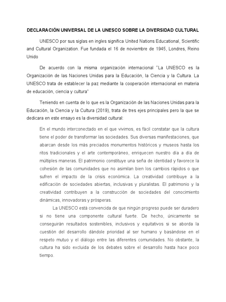 Ensayo Declaración Universal de La Unesco Sobre La Diversidad Cultural PDF Diversidad