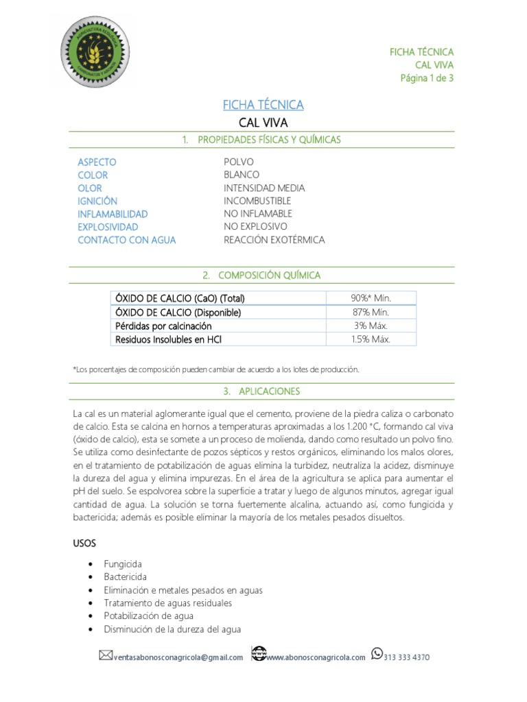 Ficha Tecnica Cal Viva PDF PDF Agua Materiales