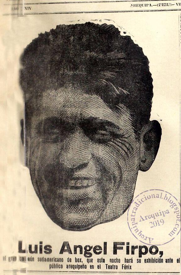 Luis Ángel Firpo (October 11, 1894 - August 7, 1960) was an Argentine boxer.Born in Junín, Argentina, he was nicknamed The Wild Bull of the Pampas. He was the first Latin American in history to challenge for the world heavyweight title. His bout against Jess Willard set a world record for boxing attendance at the time. His 1923 heavyweight title fight against Jack Dempsey was named Ring.