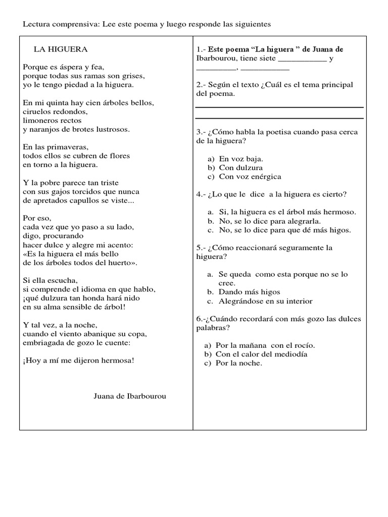 La higuera. de Juana de Ibarbourou. Porque es áspera y fea, porque todas sus ramas son grises, yo le tengo piedad a la higuera. En mi quinta hay cien árboles bellos: ciruelos redondos, limoneros rectos y naranjos de brotes lustrosos. En las primaveras, todos ellos se cubren de flores en torno a la higuera. Y la pobre parece tan triste con sus gajos torcidos que nunca de apretados capullos se.