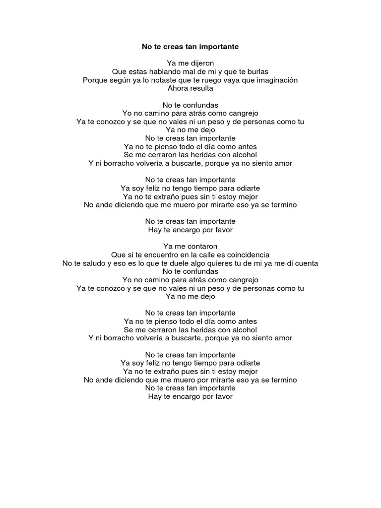 y ni borracho volvería a buscarte, porque ya no siento amor. No te creas tan importante, ya soy feliz no tengo tiempo para odiarte, ya no te extraño pues sin ti estoy mejor, no andes diciendo que me muero por mirarte eso ya se termino, No te creas tan importantes, hay te encargo por favor. Video de No te creas tan importante.