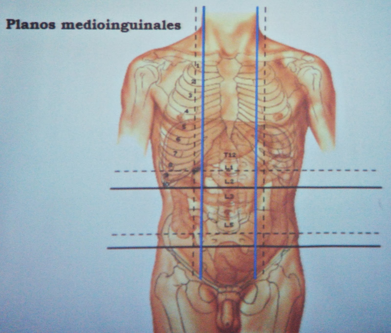 Los planos horizontales incluyen los planos subcostal e intertubercular. El plano subcostal transcurre horizontalmente a través del borde inferior del cartílago costal de la décima costilla en ambos lados del cuerpo. Finalmente, el plano intertubercular pasa a través de los tubérculos de la cresta ilíaca y el cuerpo de la quinta vértebra lumbar (L5).