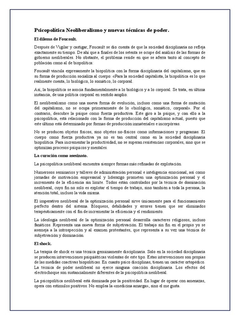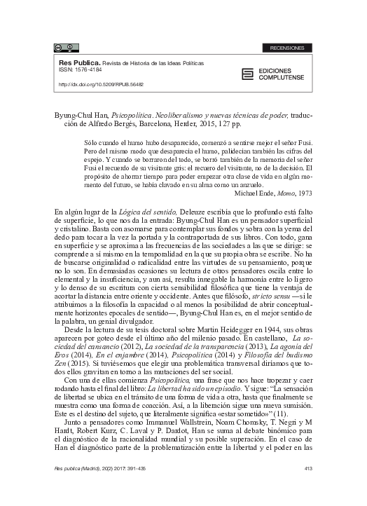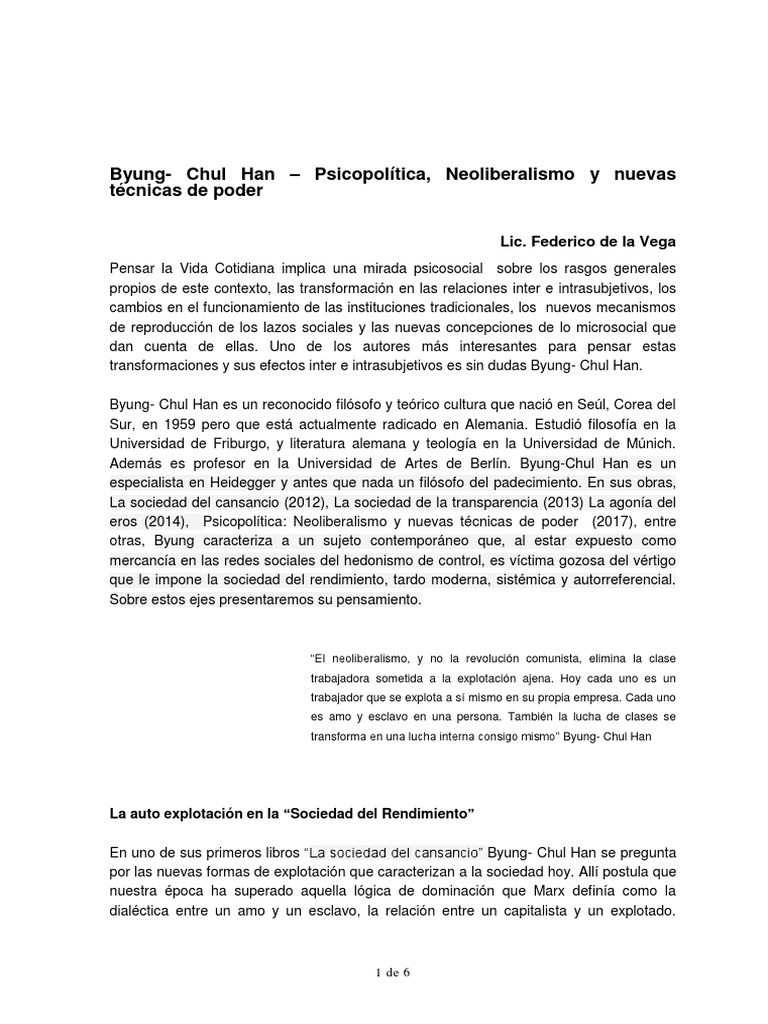 Han, Byun-Chul (2014). Psicopolítica: Neoliberalismo y nuevas técnicas de poder. te a aquellos que utilizamos de manera indirecta. Todo lo que vaya más allá de eso es de hecho difícil» (p. 220). agradeciendo a la editorial Plaza y Valdés, así como a su colección «Dilemata», la posibilidad que brinda a los lectores cas-tellanos de.