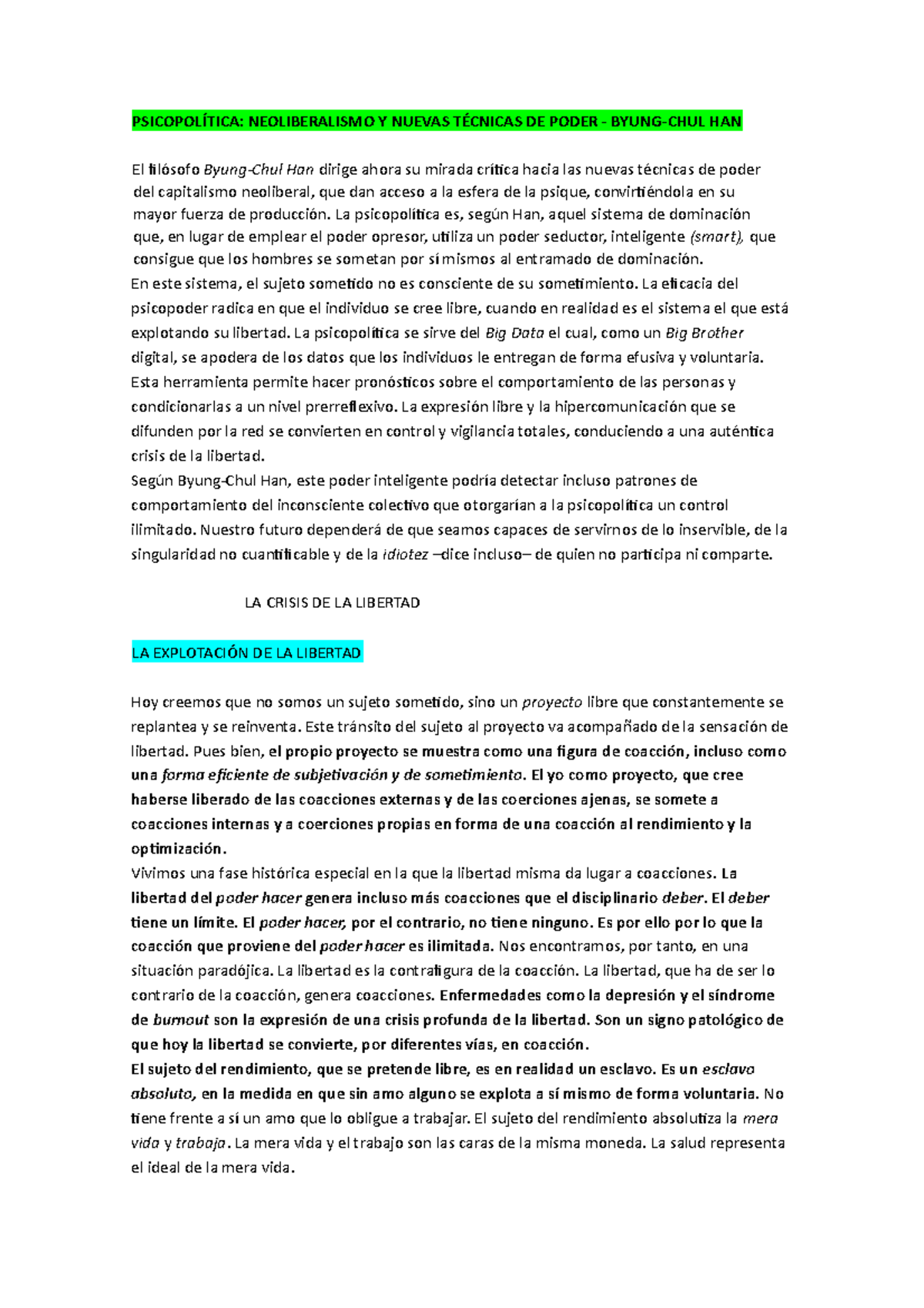 resumen del texto de Han PSICOPOLÍTICA NEOLIBERALISMO Y NUEVAS TÉCNICAS DE PODER BYUNGCHUL