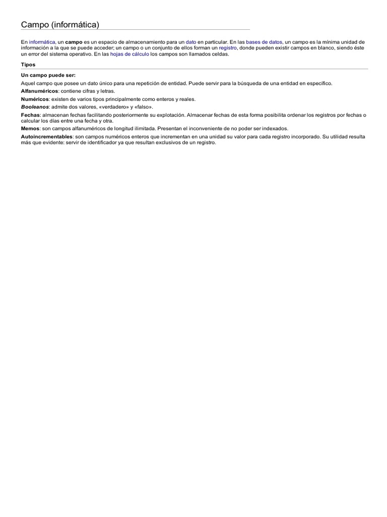 Definición de Campo (informática) En informática, espacio para el almacenamiento de un dato en particular. Los campos suelen tener asociados un tipo de dato que permiten almacenar, es decir, si el campo debe ser un número entero, una fecha, un texto, etc. El tipo de dato permite determinar el tamaño del campo, que puede ser fijo o variable. Campo en informática puede significar: - En las.