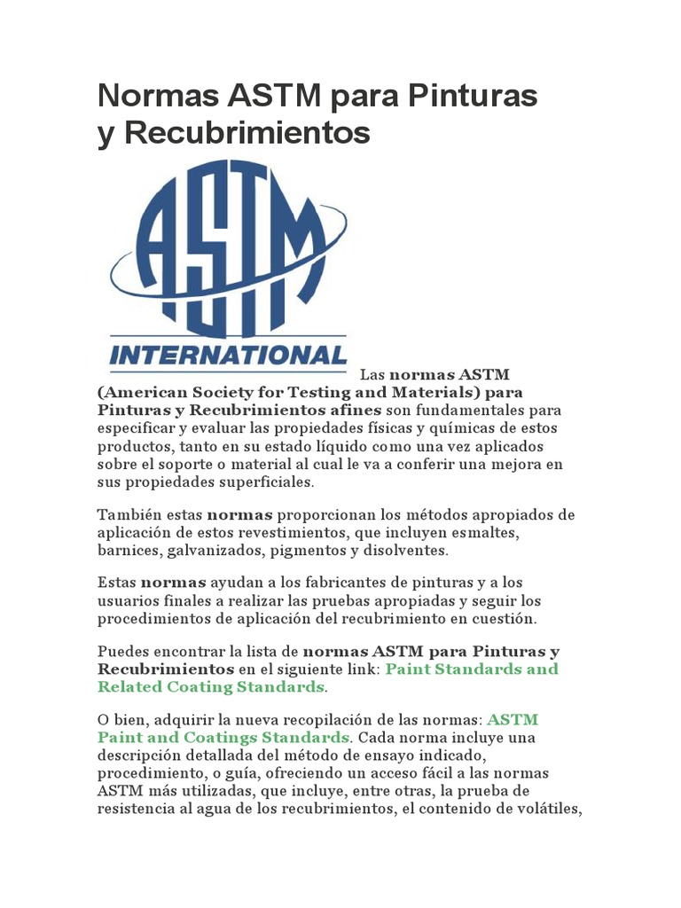 Normas ASTM para pinturas y recubrimientos. Estas normas ASTM contienen requerimientos específicos y diversos con respecto a las pinturas y los revestimientos, como su resistencia química, a la intemperie, su durabilidad, adherencia, entre otros.En este sentido, enseguida te presentamos el reglamento al respecto. D-6899-03: Determina el método que simula la corrosión que los aceros.